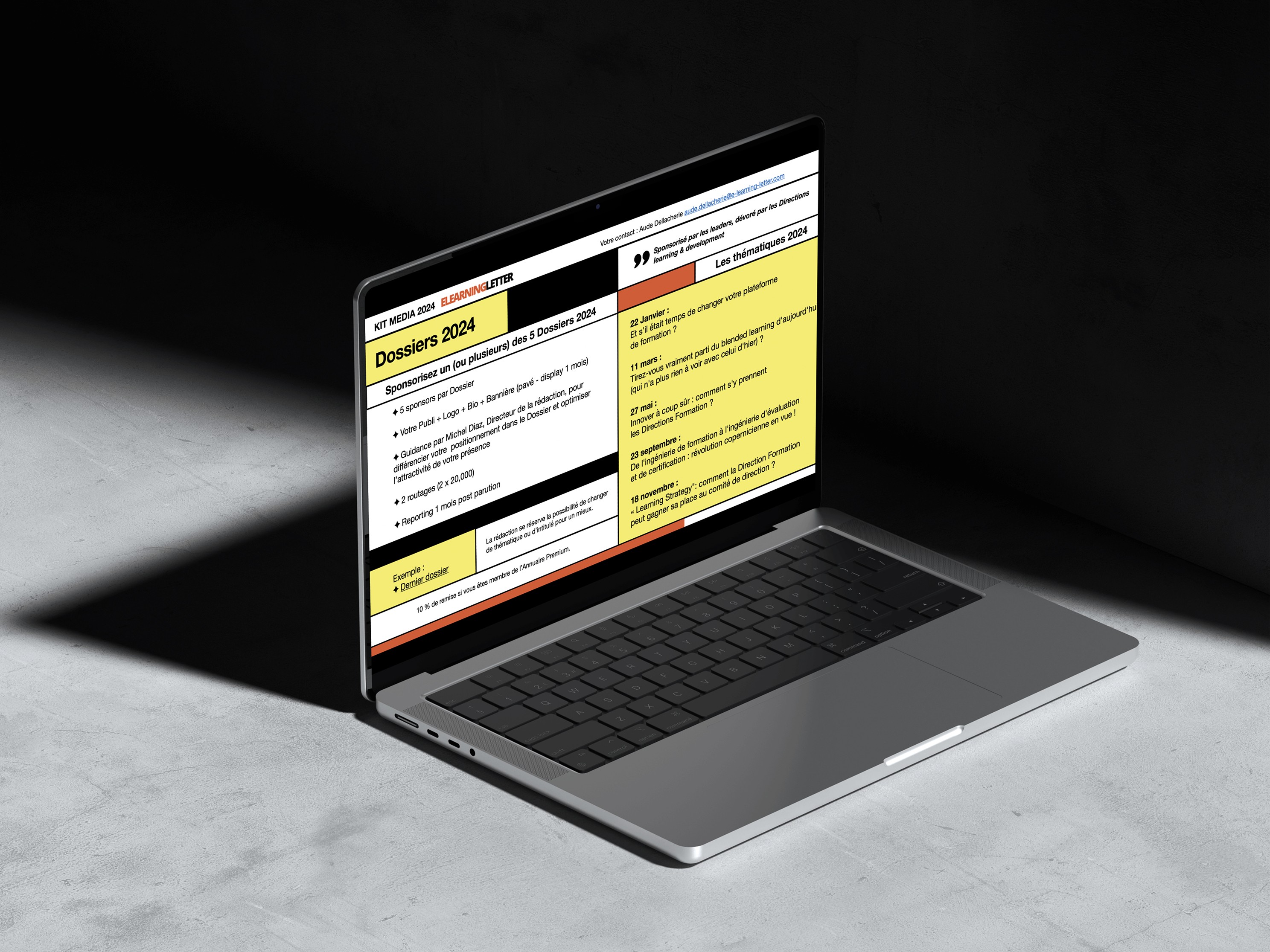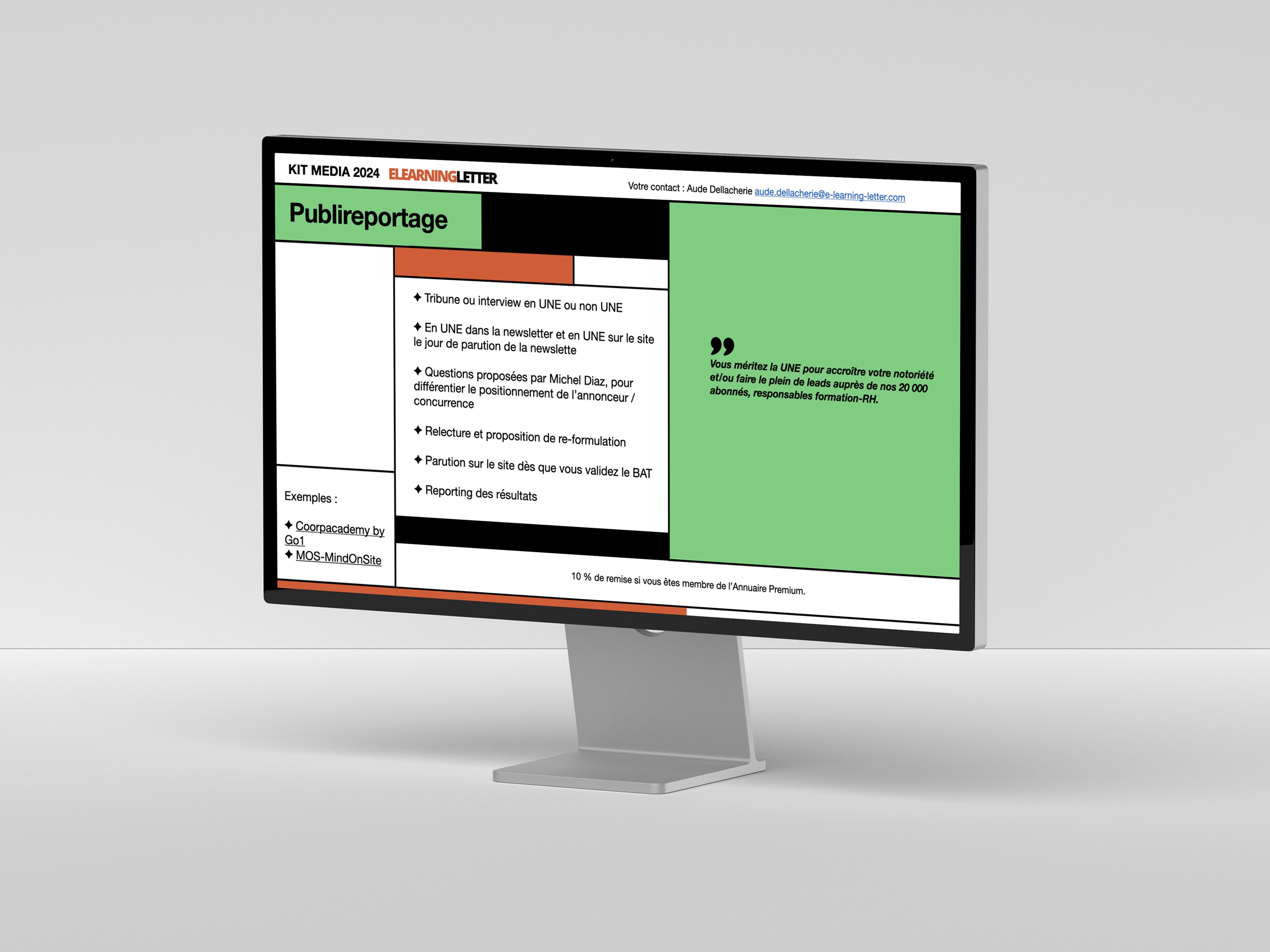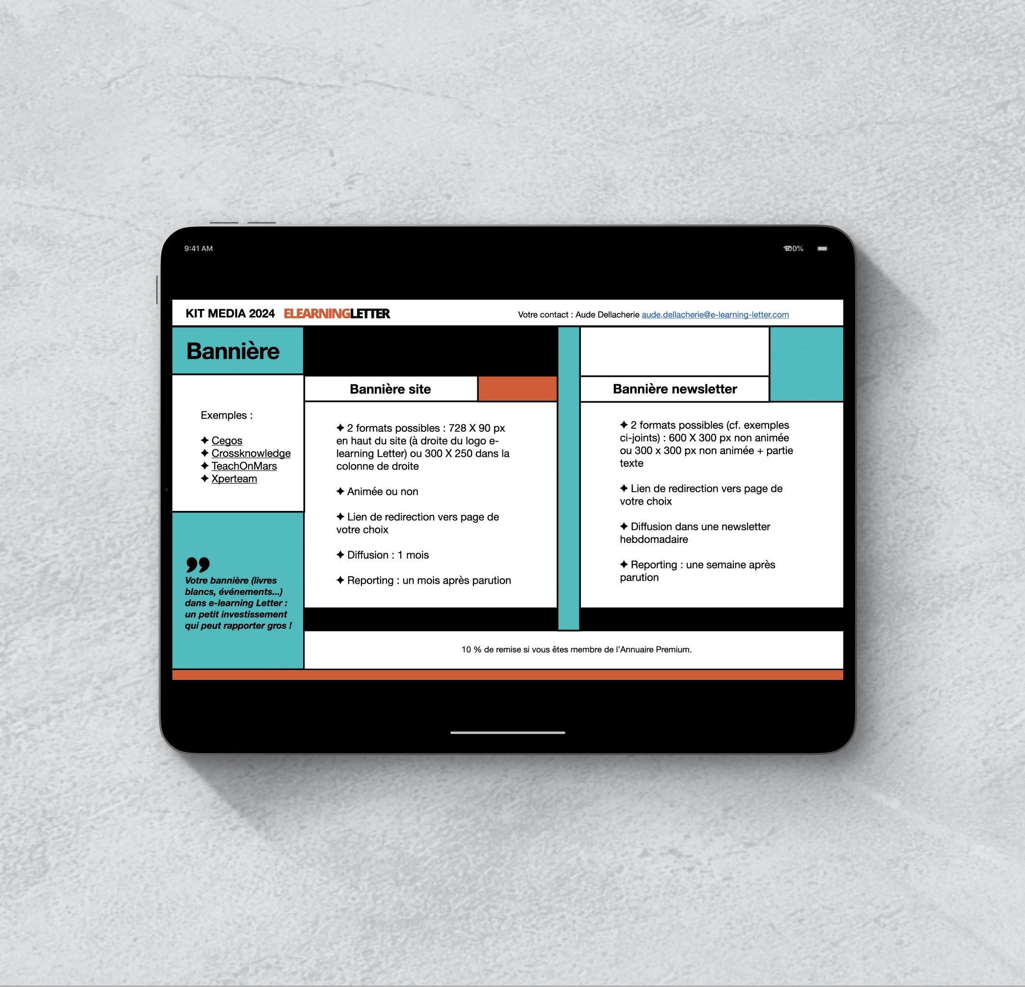Création d'une nouvelle charte graphique pour le kit média diffusé sur le site d'E-learning Letter et envoyé par mail. E-learning Letter est le 1er Web média d'information professionnelle Digital Learning dédié aux décideurs formation - RH, ainsi qu'à l'ensemble des acteurs - dirigeants, cadres, salariés... - entreprises ou organismes de formation, intéressés par l'intégration du numérique dans les stratégies et les dispositifs de formation, de développement des compétences et de la performance opérationnelle.