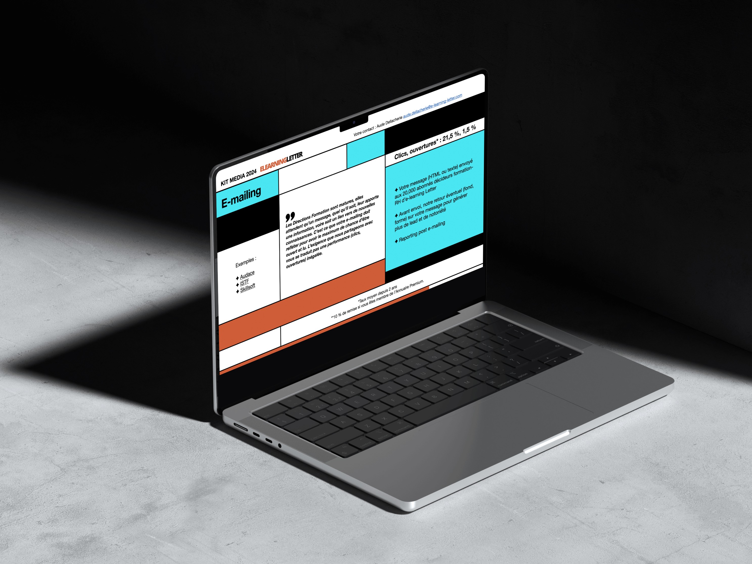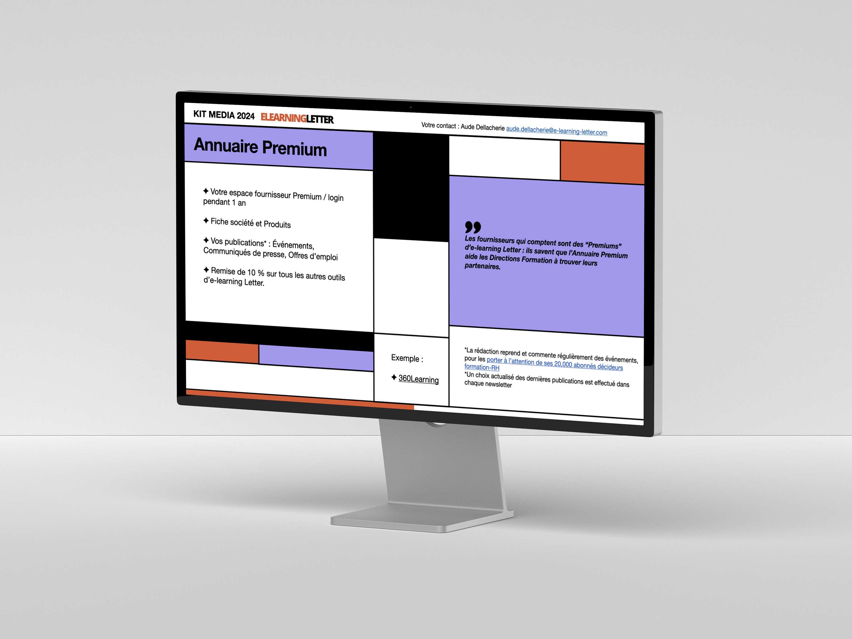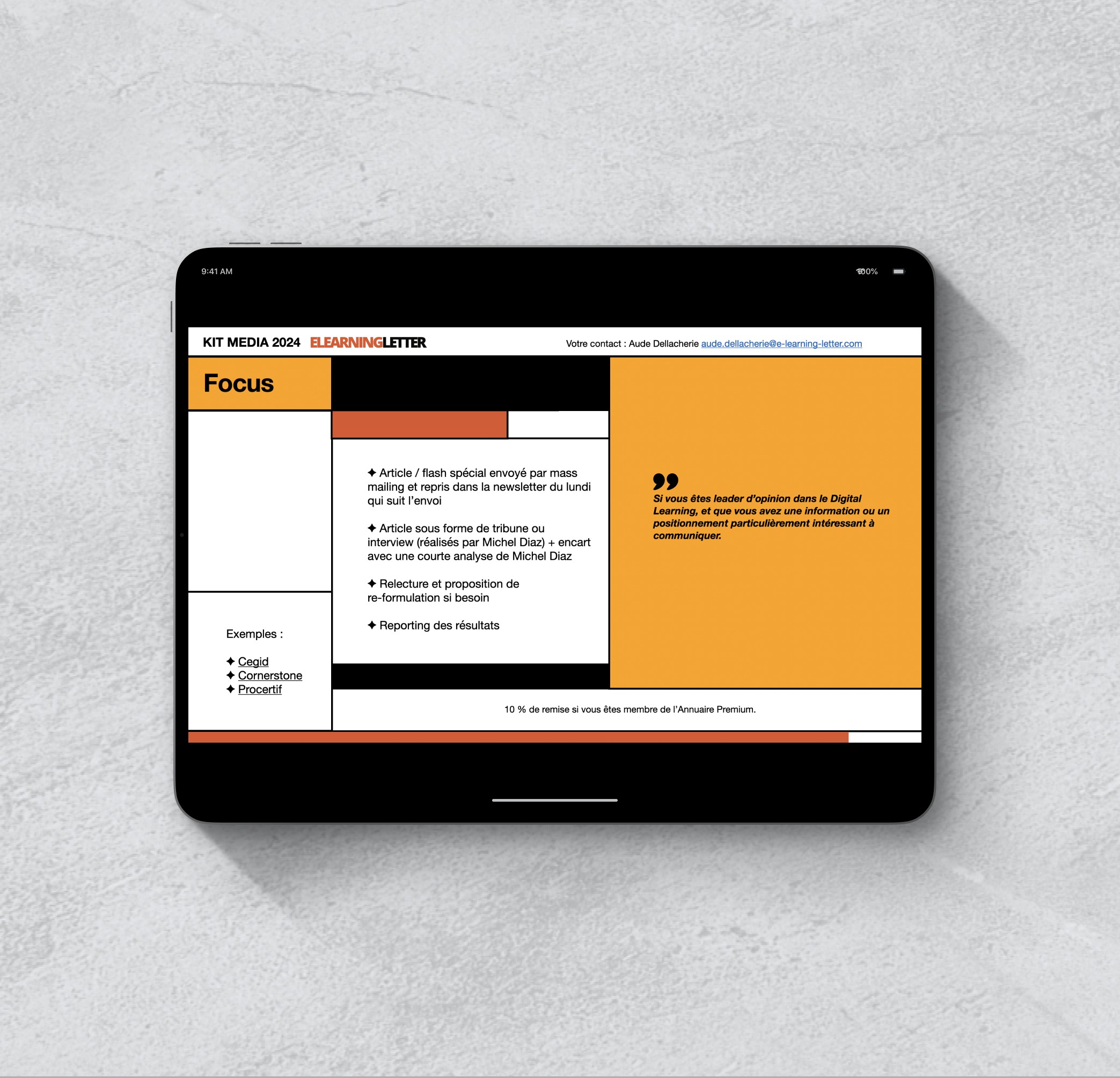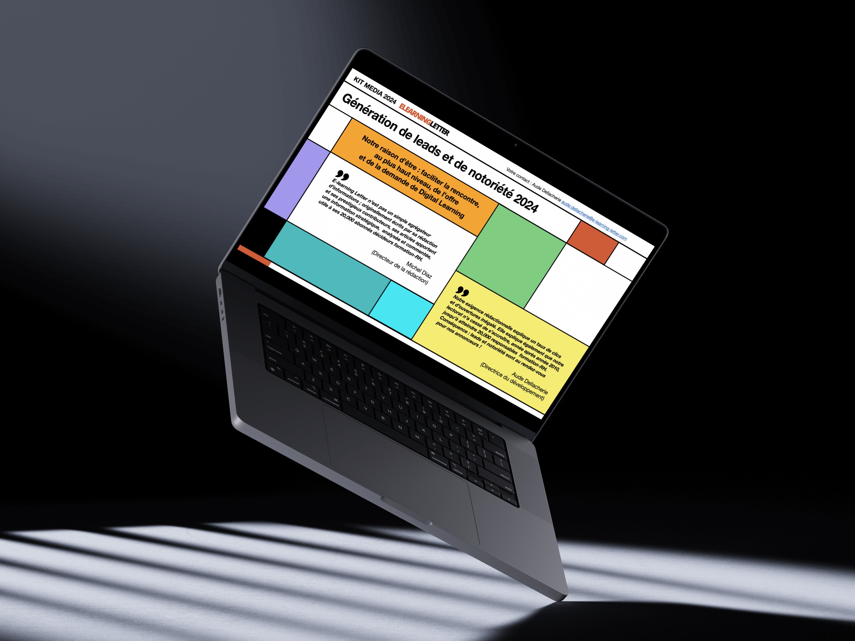 Création d'une nouvelle charte graphique pour le kit média diffusé sur le site d'E-learning Letter et envoyé par mail. E-learning Letter est le 1er Web média d'information professionnelle Digital Learning dédié aux décideurs formation - RH, ainsi qu'à l'ensemble des acteurs - dirigeants, cadres, salariés... - entreprises ou organismes de formation, intéressés par l'intégration du numérique dans les stratégies et les dispositifs de formation, de développement des compétences et de la performance opérationnelle.