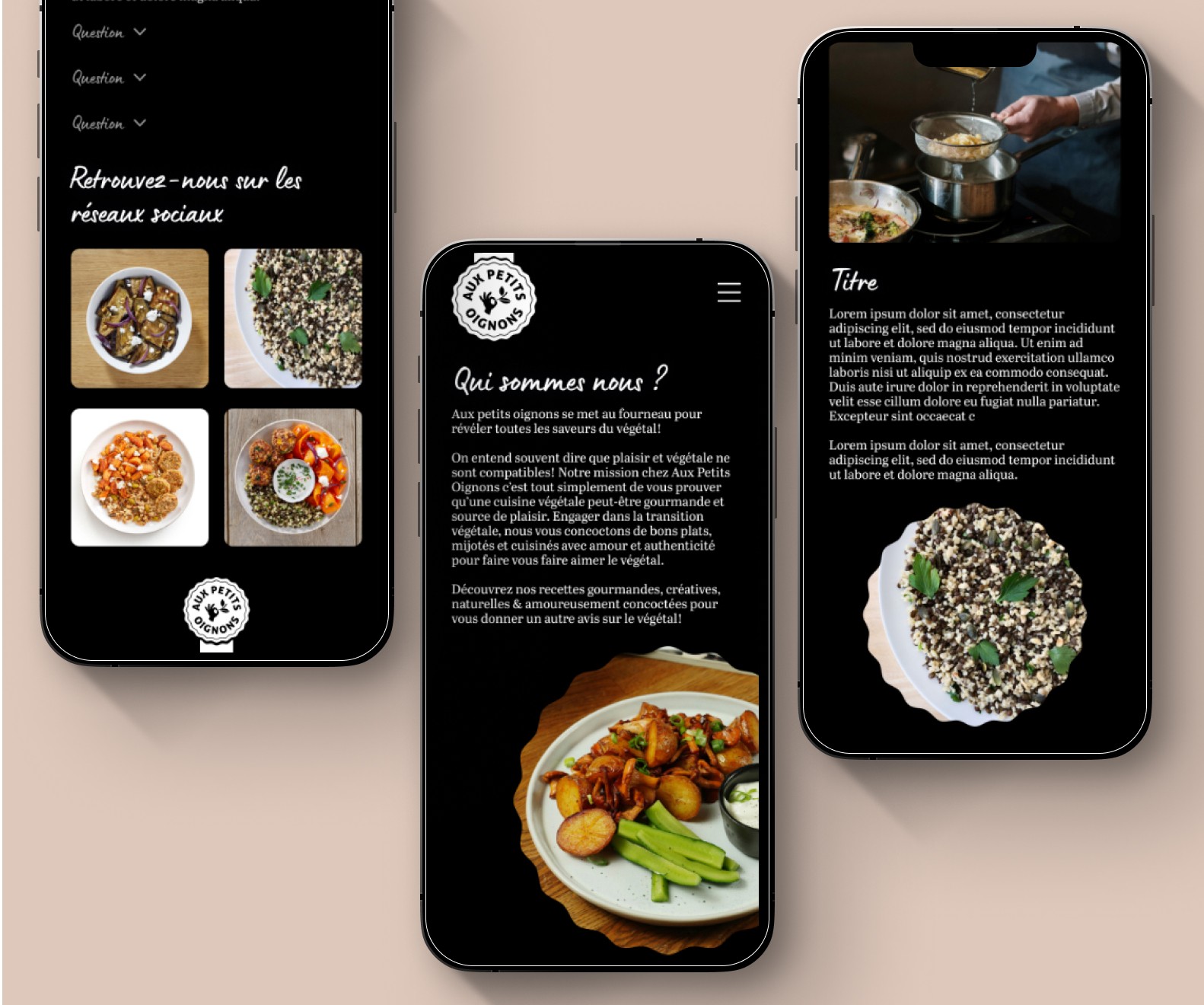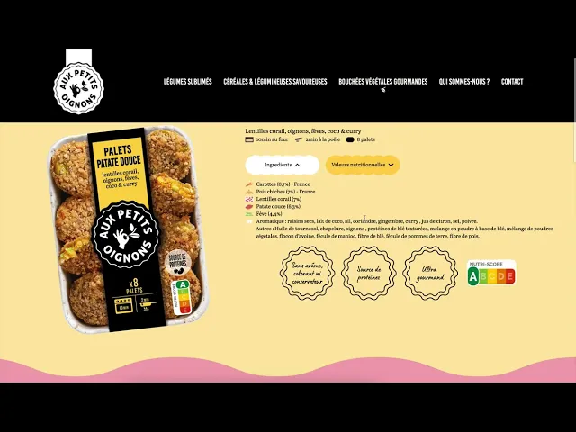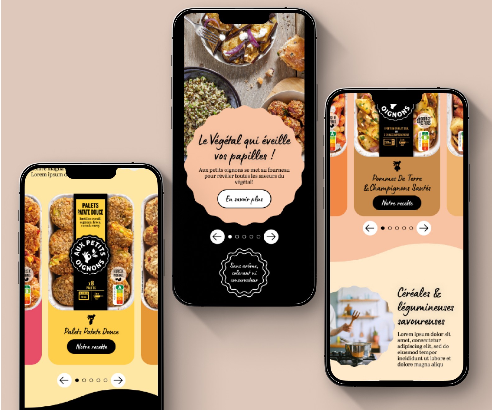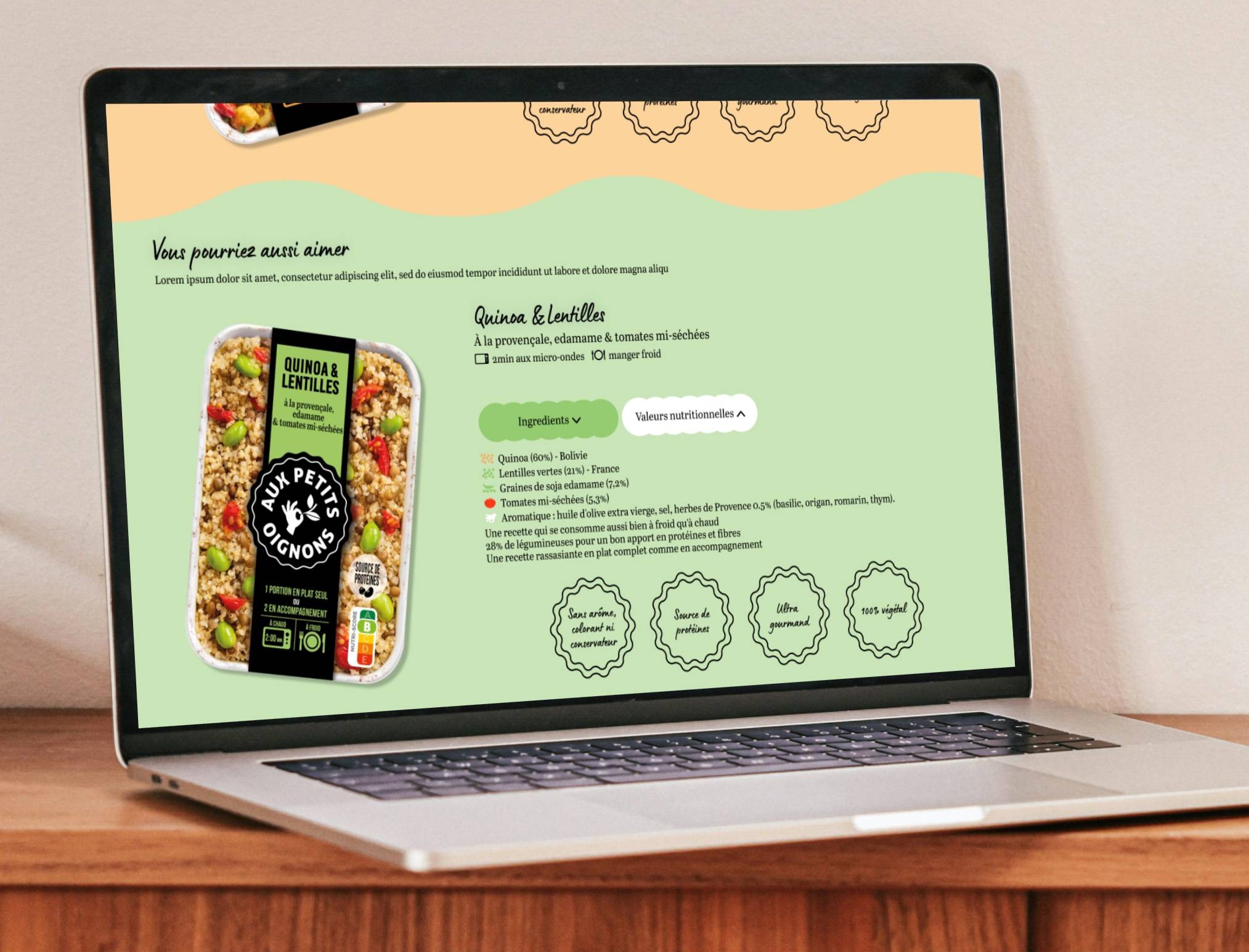 Création d’une charte graphique web pour le lancement d’Aux Petits Oignons, la nouvelle marque du Groupe Labeyrie, qui réinvente le rayon Traiteur Frais avec des recettes 100 % végétales, gourmandes et pratiques.Conception d’un site web responsive intégrant identité visuelle, illustrations, arborescence, et design system, pour mettre en avant le plaisir de déguster des produits végétaux de qualité, alliant simplicité et gourmandise.