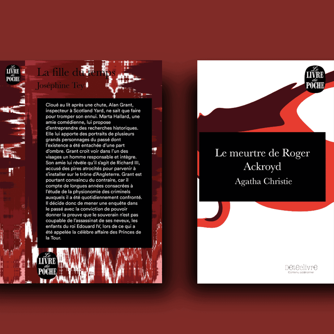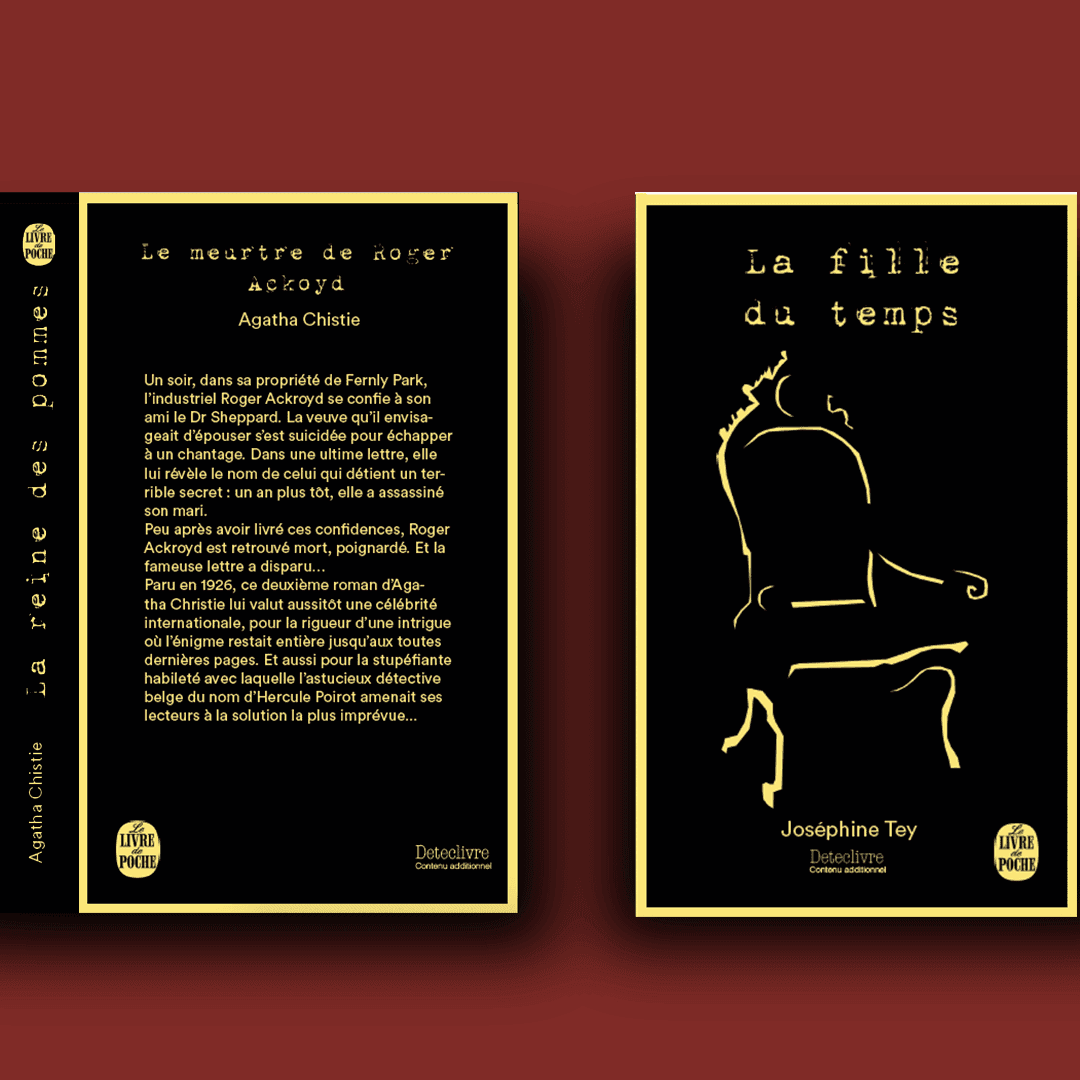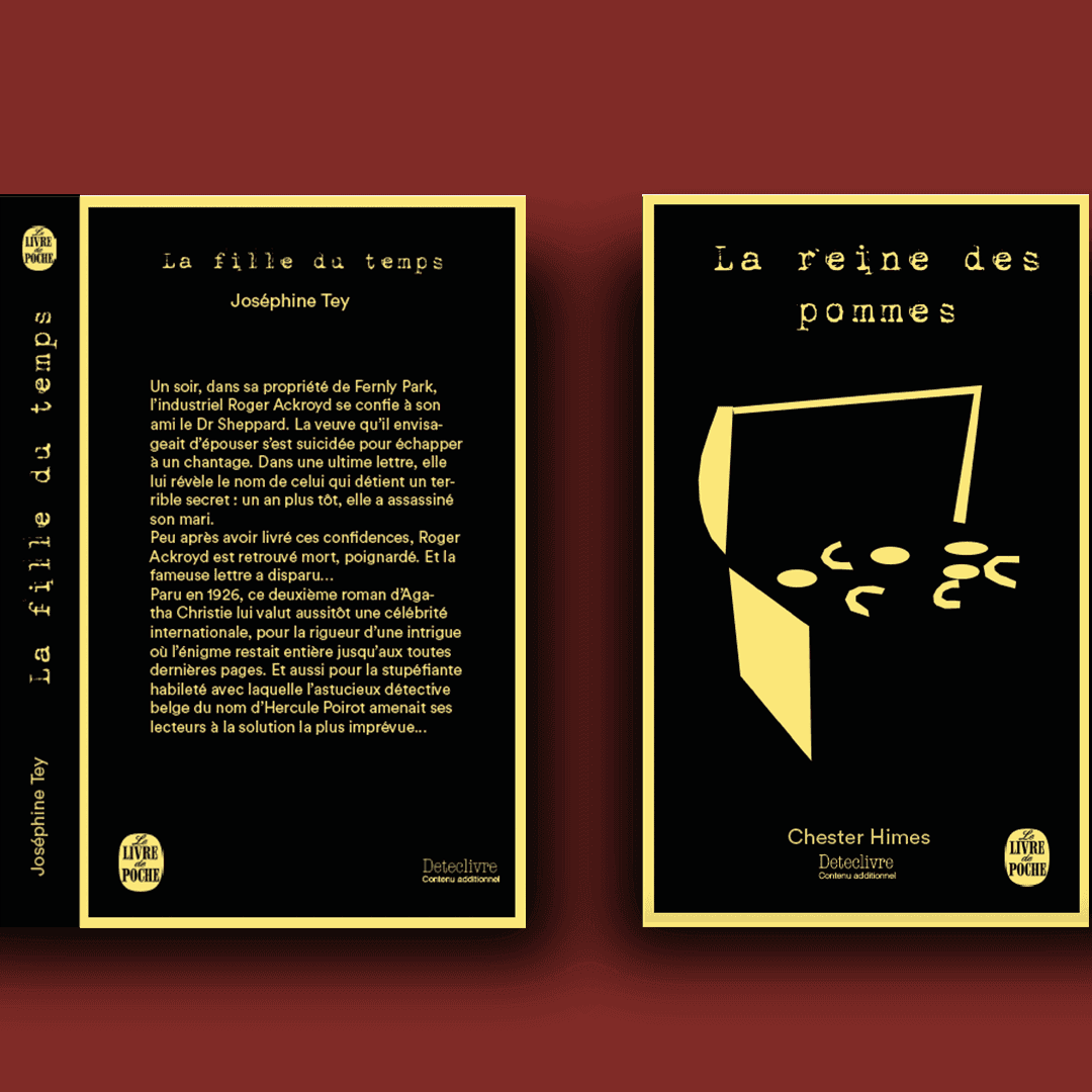 Réaliser des couvertures d’une collection de trois livres policiers : La fille du temps de Joséphine Tey, Le meurtre de Royers Ackroyd d’Agatha Christie, La reine des pommes de Chester Himes